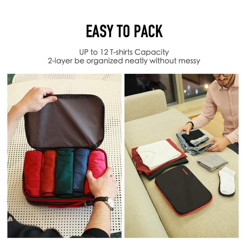 - 9L 2PCS COMPRESSION PACKING CUBE SET - The necessary items for short trips. The set size fits perfectly in your backpack, luggage, suitcase organizer, and hotel drawers. Separate your dirty clothing from your fresh clothes, keep your backpack or luggage organized in style.