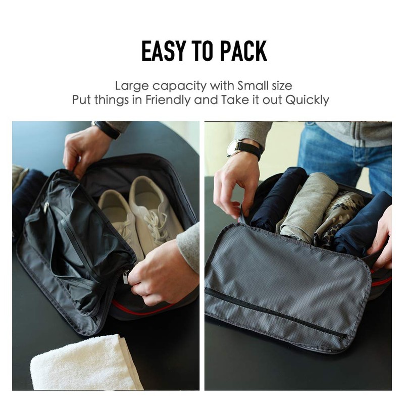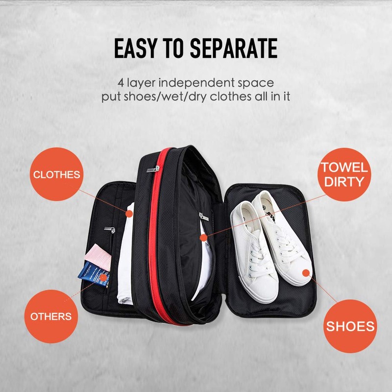 - KEEP CLEAN AND TIDY - Double-layers partition separated from wet and dry clothes and smell, ideal for family vacations, business trips, outdoor camping, and daily storage.