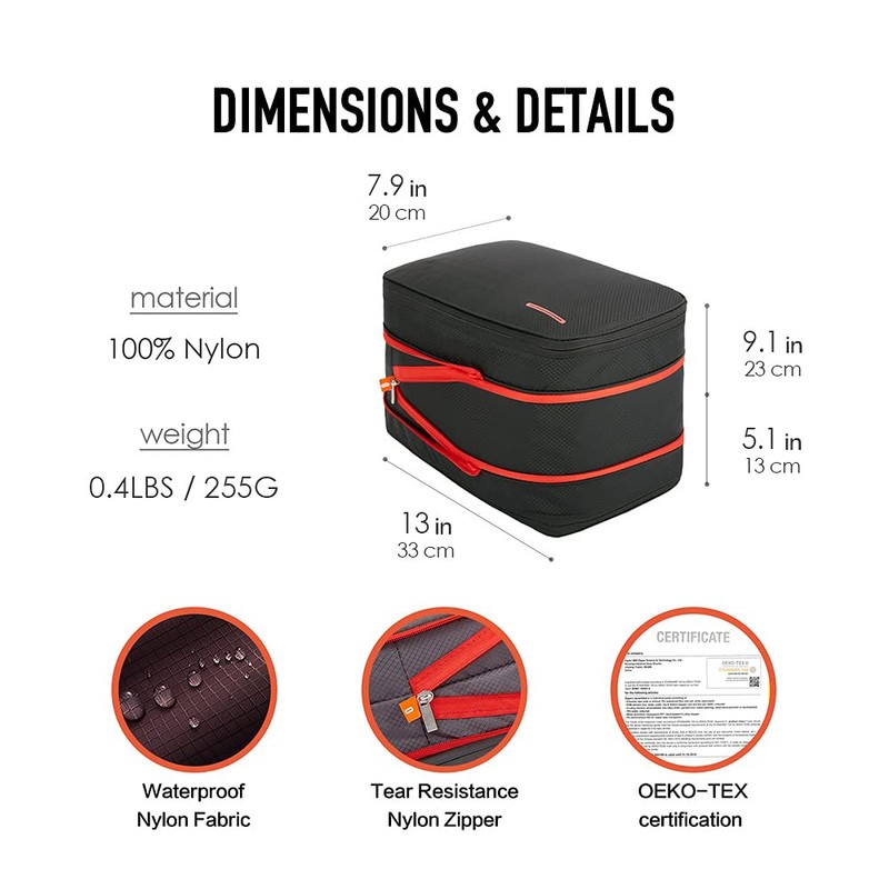 - SAVING 50% SPACE - The compression zippers literally compress your clothes together and eliminate wasted space. 9L can easily put into your backpack and luggage after compressed.
