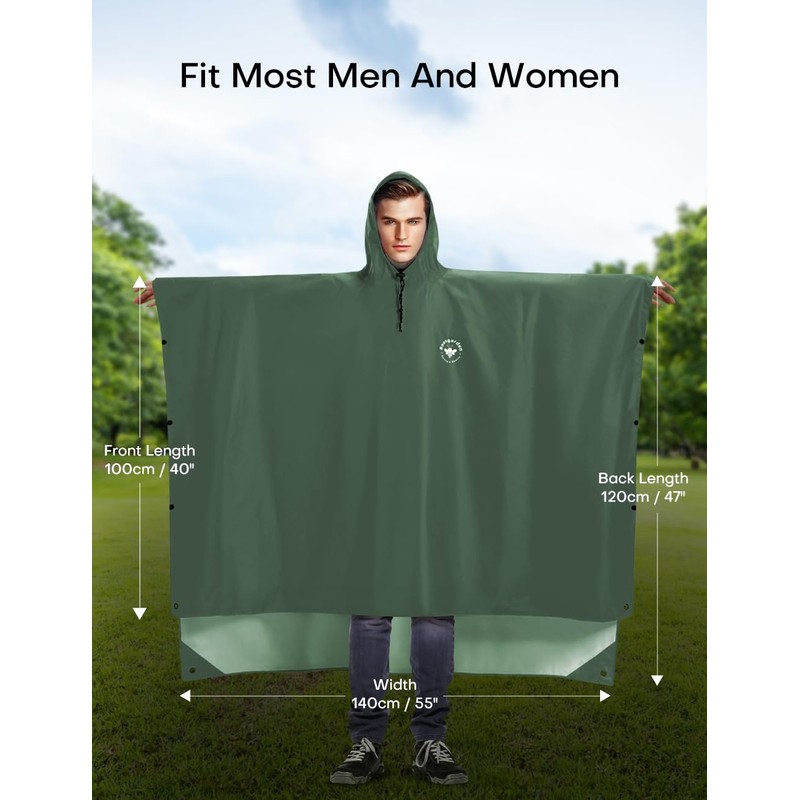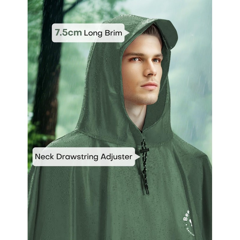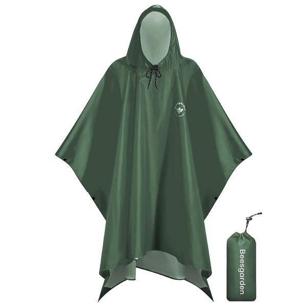 Beesgarden Hooded Rain Poncho for Adult, Upgrade TPU Coating IP8000mm Waterproof Rating, Reusable Portable Unisex Hooded Rain Poncho for Outdoor Hiking, Camping, Concert, Travelling - Green
