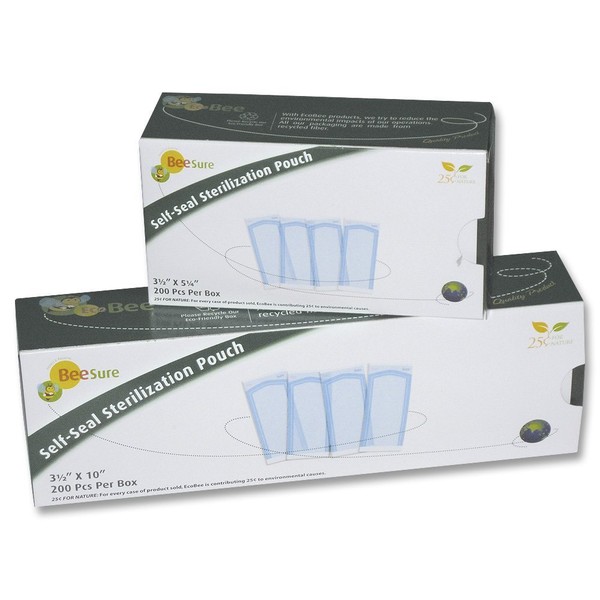 • BeeSure Self-Seal Sterilization Pouches feature built-in steam and gas 360 degree-Surround process indicators. Triple-sealed rails ensure security and tear-resistance. Plus, corner tack seals prevent curling and separation after sterilization. Water-based, lead-free links and solvent-free lamination adhesives are environmentally-friendly and non-toxic. 200 pouches per box.