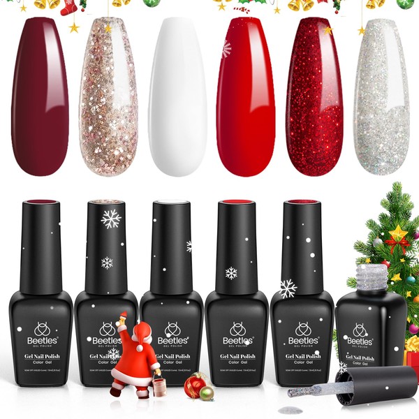 Beetles Christmas Gel Nail Polish – Candy Cane Gel Polish Set, 6 Color Burgundy Red Glitter White Silver Winter Snow Holiday Sparkle Manicure Kit Soak off Uv Nail Art Design Gifts for Women