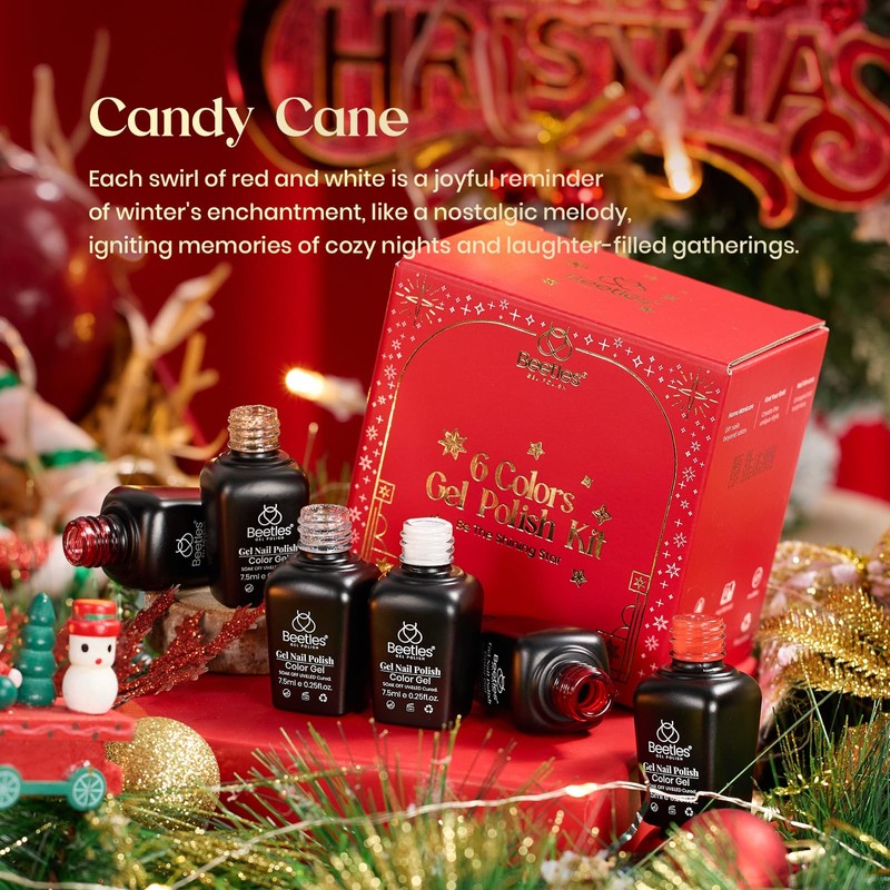 - 6 Candy Cane Gel Polish (6*7.5ml / 6*0.25fl.oz): We have put together the top 6 trendiest colors for the year 2024! We studied the upcoming color trends closely so you can display a colorful, stylish, modern manicure every time for a joyful holiday It comes with Snow White, Glitter Red, Flame Red, Rose Gold Silver gel nail polish for a DIY Holidays gel polish kit at home.