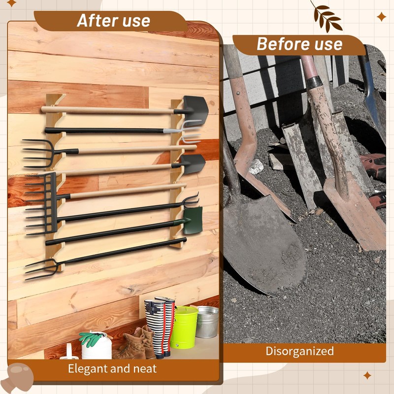 - Horizontal Wall Organizer: the horizontal design of the garden tool rack wall mount make it easy and convenient to organize and access tools; Its open structure allows for easy visibility, enabling to find the tools you need quickly, improving workflow efficiency