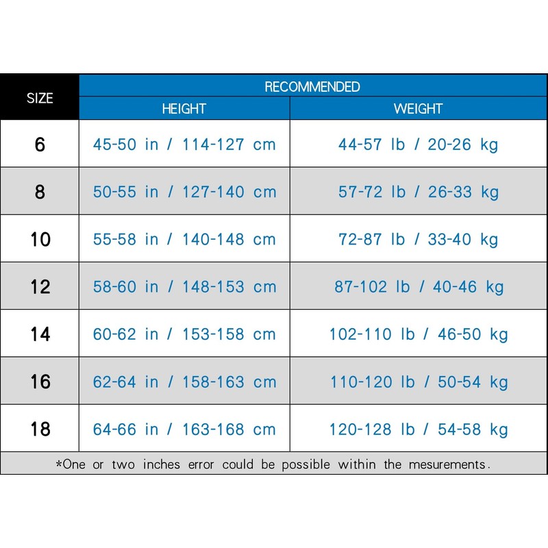 Size Recommendation: Size 6: Recommended Height: 45-50 in (114-127 cm) / Recommended Weight: 44 - 57 lb ( 20-26 kg) Size 8: Recommended Height: 50-55 in (127-140 cm) / Recommended Weight: 57 - 72 lb (26 - 33 kg) Size 10: Recommended Height: 55-58 in (140-148cm) / Recommended Weight: 72 - 87 lb ( 33- 40 kg) Size 12: Recommended Height: 58-60 in (148 - 153cm) / Recommended Weight: 87 - 102lb (40- 46 kg) Size 14: Recommended Height: 60-62 in (153 - 158cm) / Recommended Weight: 102 - 110 lb ( 46 - 50 kg) Size 16: Recommended Height: 62 – 64 in (158 – 163 cm) / Recommended Weight: 110 - 120 lb (50 - 54kg) Size 18: Recommended Height: 64 – 66 in (163 – 168 cm) / Recommended Weight: 120 - 128 lb (54 - 58 kg)