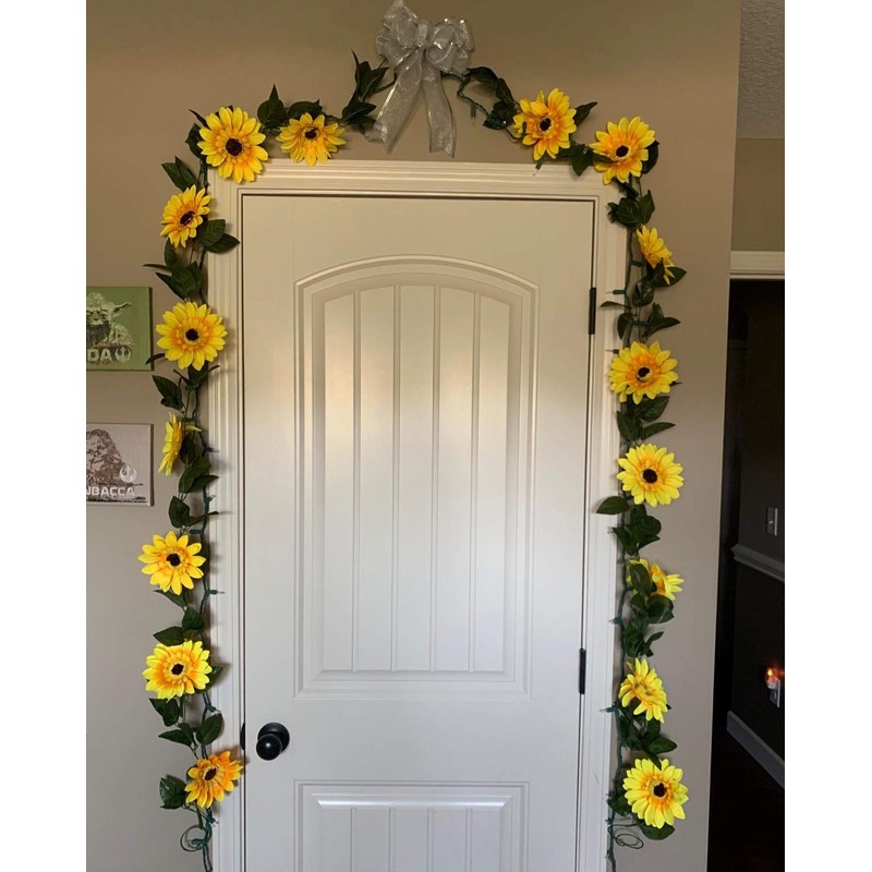 This artificial hanging flowers plants, which is constructed of plastic and fabric material. Unlike ths real plants, this plants will never die off, so that it can be a nice decoration for a long time. Hanging this artificial vine leaves, it will be a beautiful decoration for your home, office, garden or etc. You can hang it on the wall, doors, swing, mirrors and anywhere as you like to enjoy with artificial flowers vine. Artificial Wisteria Vine Features: Special craft Purely manual process Realistic visual effect and handfeel Usages: Living room, wedding, balcony, stairs, shopping mall, party, swing, lift, office, pipeline, and so on. Occasions: Home, office, dormitory, classroom, garden, restaurant decoration Package Included: 4 pcs artificial sunflower garland Each length is 7.2 feet, a total of 28.8 ft long and 32 sunflower flower heads.