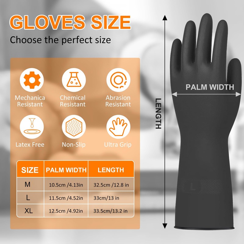 - DURABLE MATERIALS: The heavy duty cleaning gloves are crafted from high-quality natural latex for superior elasticity and durability. Acid resistant gloves provide exceptional protection against chemicals, acids, alkalis, solvents, and mechanical hazards, making them ideal for oily environments.