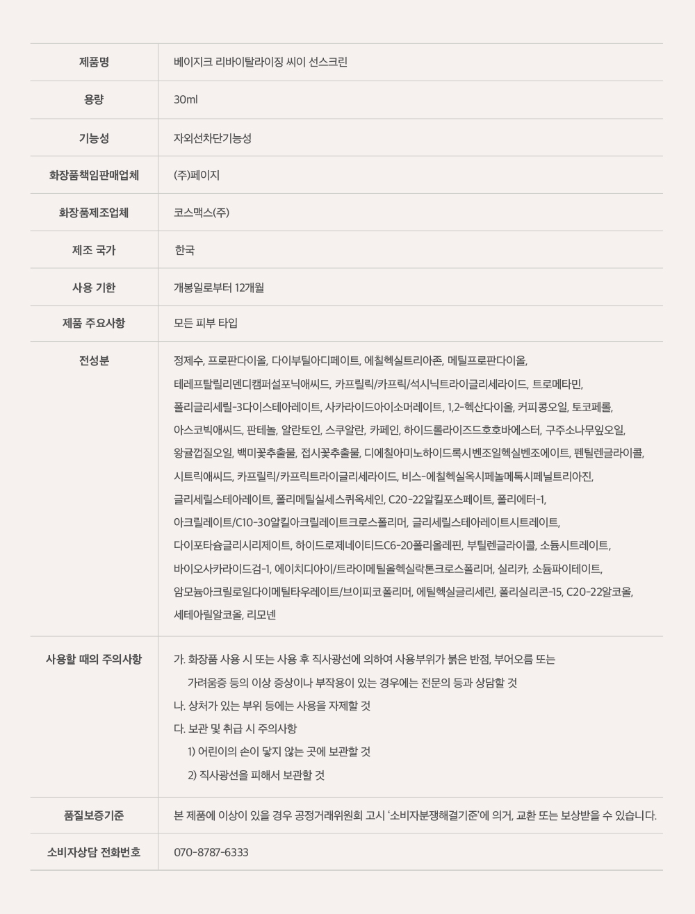 Beige Revitalizing CE Sunscreen SPF50+ PA++++ / 베이지크 리바이탈라이징 CE 선스크린 SPF50+ PA++++