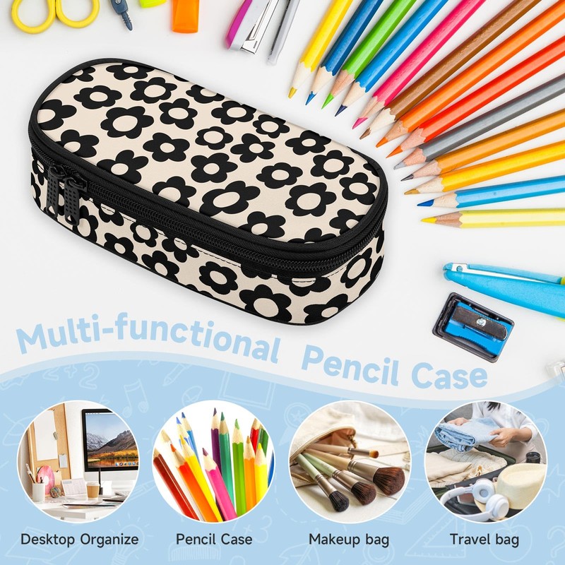 Beige with Black Flower Large Pencil Pouch Big Capacity Cute Pencil Case for Girls Boys Teen Women Men Adult,Portable Kids Pencil Bag with Zipper,Stationery Storage Pen Bag for School Office Organizer