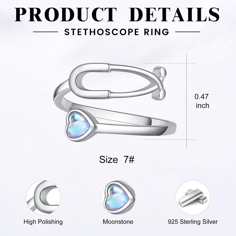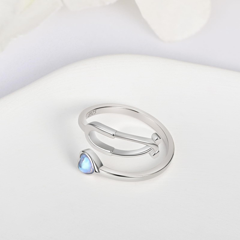 BEILIN Stethoscope Rings for Women 925 Sterling Silver Adjustable Heart Moonstone Ring Nurse Doctor Jewelry Graduation Gifts for Medical Student (Moonstone)