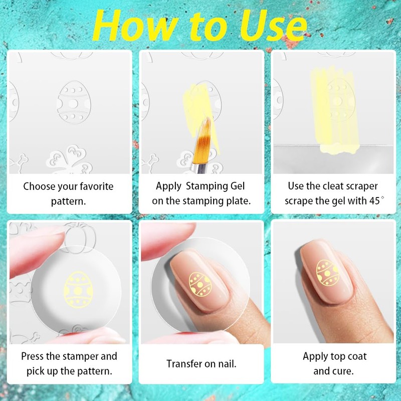 - Easy to Use: 1. Apply paint adhesive to the stencil, then use the scraper to quickly scrape off the excess 2.Use silicone stamper to press down on the transfer pattern 3. Quickly transfer the pattern onto your nails 4.Bake dry to apply sealer then shine the lamp