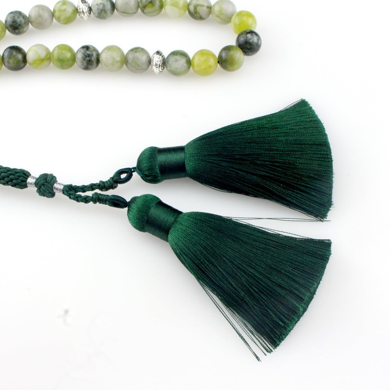 - ABOUT THIS ITEM: Muslim Islamic Tasbih Rosary Prayer Beads, design featuring with 33 beads 10mm ( cyan green jade Nature Stone Round Beads), the spacer beads(Silver alloy beads), 10 by 30mm of the Imam beads(Silver alloy ), featuring handmade string line and woven tassels, packaging design(exquisite bag, free)