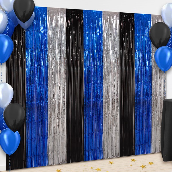 BEISHIDA 3Pcs Black Blue Silver Door Streamer Backdrop Foil Fringe Tinsel Curtains Backdrops for Boy Men Birthday Baby Shower Bachelor Party Decoration (3.28 ft x 6.56 ft)