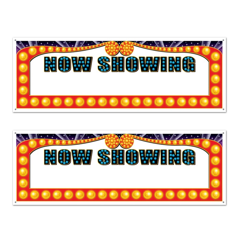 Beistle S50218AZ2 now showing Sign banner. Includes 2 banners in the package. Each banner is 60 inches wide by 21 inches tall. They are made of plastic and can be used indoors and outdoors. You can personalize the banners by writing below the words "now showing". these banners are great for many different theme parties and movie night gatherings!