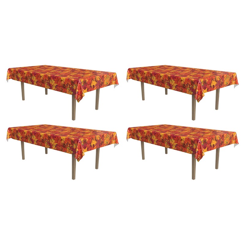 - SET OF FOUR FALL LEAF TABLE COVERS: This pack includes four plastic table covers adorned with a delightful pattern of vibrant fall leaves, adding a touch of autumn beauty to your tablescape.