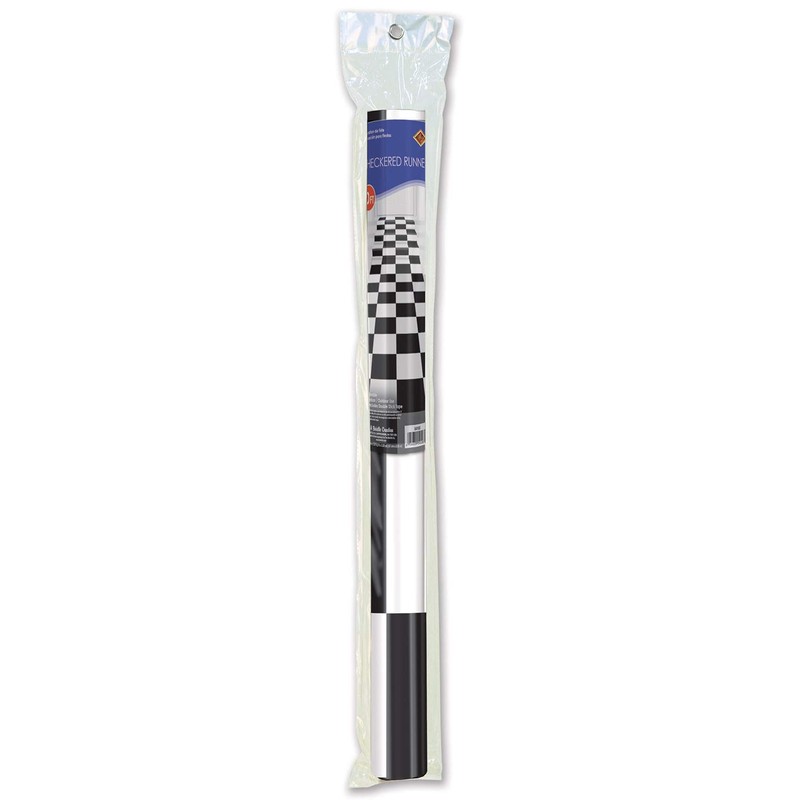 Beistle Checkered Runner. The black and white checkered runner is perfect for a racing themed party It is made of a poly material with double-stick tape. The runner measures 24 Inch wide by 10 feet long.