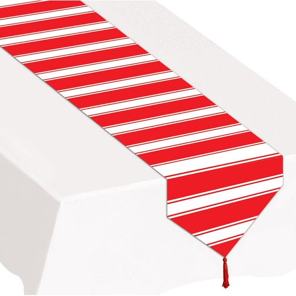 The printed red and white Stripes table runner is made of board stock and measures 11 inch wide by 6 feet long. Both ends are tapered with tassels attached. Decorate for a circus themed party with this table runner! .