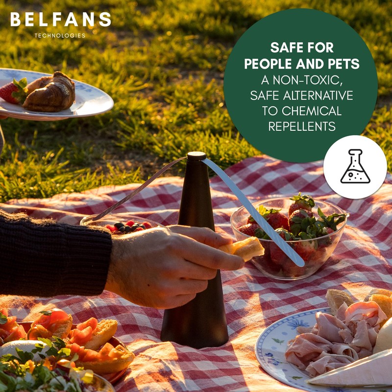 The Belfans Fly Repellent Fan for Tables is the perfect solution to keep flies, bees, and bugs away from your food while dining indoors or outdoors. Designed with soft holographic fan blades, it creates a harmless, soundless barrier that confuses flies, making it an ideal fly swatter alternative. This portable tabletop fan is USB-powered and battery-operated, giving you the flexibility to use it anywhere—whether on picnic tables, patio tables, restaurant tables, or camping trips. Unlike noisy electric fly swatters or sticky fly traps, this small battery fan operates quietly, ensuring a comfortable dining experience. Its lightweight and compact design makes it easy to carry for outdoor entertaining, tailgating, and patio use, while the safe and durable construction guarantees long-lasting performance. Whether you're enjoying a picnic, barbecue, or relaxing on your patio, this fly repellent outdoor fan provides hassle-free insect protection without the need for sprays. Say goodbye to annoying flies and enjoy your meals in peace with this versatile and efficient fly fan.The secret is in the science! The soft-blades’ Unique Holographic Dots refract light, creating bending, colorful patterns that flies, bees and wasps instinctively avoid. In their tiny bug brains, this unnatural effect screams danger, prompting them to buzz-off to a safer place—far away from your food.