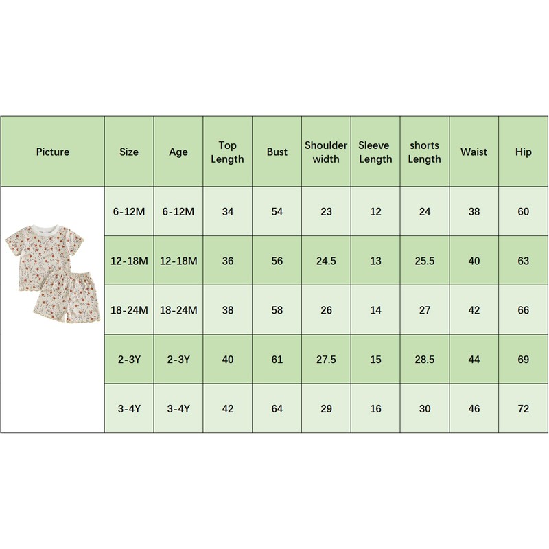 6-12M Tops Length: 13.39 Bust: 21.26 Sleeve: 4.72 Shoulder: 9.06 Pants Length: 9.45 Waist: 14.96 Hip: 23.62 Advised Age: 6-12 Months