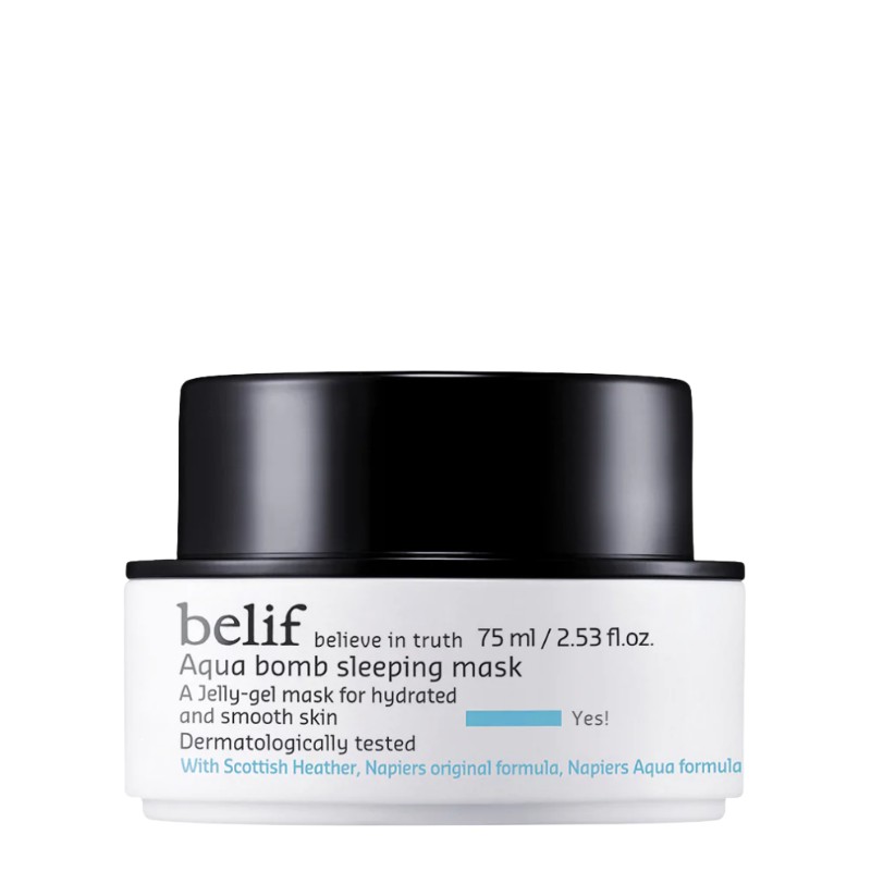 🌸 belif Aqua Bomb Sleeping Mask is an innovative jelly-pudding sleeping mask to replenish and revive dull, dry skin with explosive hydration for a dewy, radiant glow.