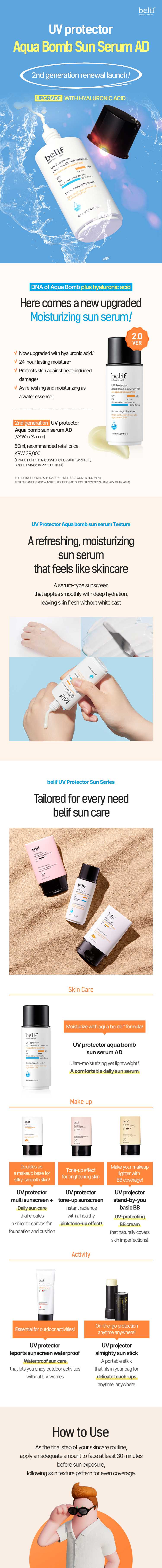 It is a serum-type sunscreen that applies smoothly and moisturizes, leaving a refreshing feeling without a white cast. UV Protector Aqua Bomb Sun Serum that provides belief’s iconic Aqua Bomb moisture in sunscreen formula. A triple functional cosmetic for skin brightening, wrinkle improvement, and sun protection.