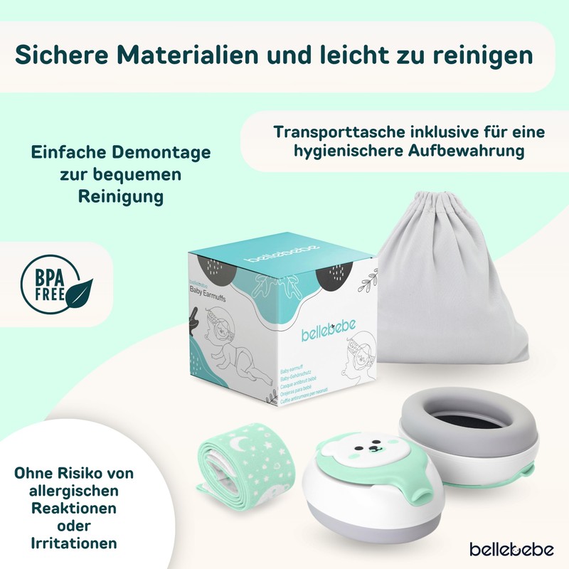 BELLEBEBE - Ear Defenders Baby - 0-36 Months - Hypoallergenic and BPA Free - EN352-1, RoHS, CPC Certified - Adjustable Headband & Carry Bag, Verde Menta