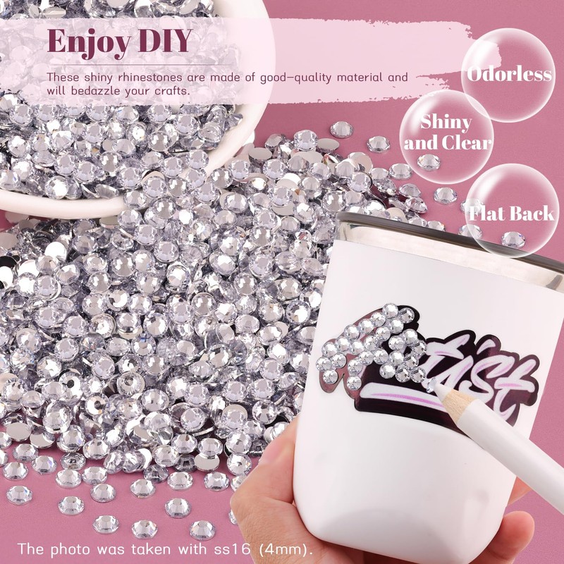 PACKAGE CONTENT -- The package contains approx. 4000 pcs of 5mm-SS20 (0.20") bling-out resin rhinestones (Clear). The large amount will support you to fulfill a number of your wonderful DIY decoration ideas. Additionally, 1 tweezers and 1 pickup pen are included for easily picking up of glittering gems.TIPS FOR USE -- Non-hot fix flatback gemstones require adhesive for nail art, crafts, or artwork design. We recommend using B7000 rhinestone jewelry glue for DIY projects and UV / quick dry nail glue for nail art. To apply the resin rhinestones, first, clean the surface of your nails or the crafts you wish to embellish. Then, apply the rhinestones with the appropriate glue and wait for them to dry. (Please note that glue is not included.)WIDE APPLICATION -- These sparkling iridescent resin rhinestones are perfect for creating dazzling looks. Use them for face makeup, eye makeup, body art, 3D nail art or bedazzling DIY crafts like shoes, tumblers, mugs, bottles, phone cases, popsockets, scrapbooks, photo frames, diamond paintings, greeting cards, bags, glasses, guitars, keychains, hats, masks, hair clips, bracelets, wristbands, clothing, wedding dresses, and more. Apply it to what you want to bling!HIGHLIGHTS -- Resin rhinestones are packaged by weight, with each pack containing approximately 4000 pieces. Our store also offers a variety of colors and sizes of resin rhinestones. A sufficient amount of resin gems are suitable for paving large area designs such as diamond paintings or cups. By choosing resin rhinestones with similar or contrasting colors, you can create color-coordinated or highly contrasting works, such as phone cases with gradient effect or colourful festival decorations.