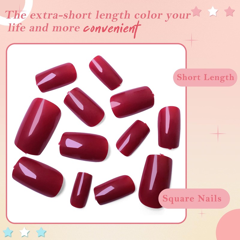 - Reusable false nail: The short nails press ons square are easily removed and can be reapplied many times without losing their adhesion. Artificial nails stick on nails are easy to trim and decor, and it won't fade or break easily. Pick the suitable size, use jelly glue and press for 15 seconds, you can get a salon quality press in nails!