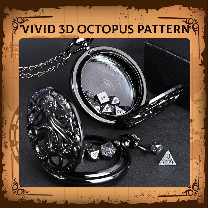 - Unique design: discover the BelleVive dice set with its eye-catching 3D octopus design. These mini dice are housed in a pocket watch case that adds creativity and uniqueness to your collection of game accessories. Whether for role play or as a collector's item, these dice are a real eye-catcher