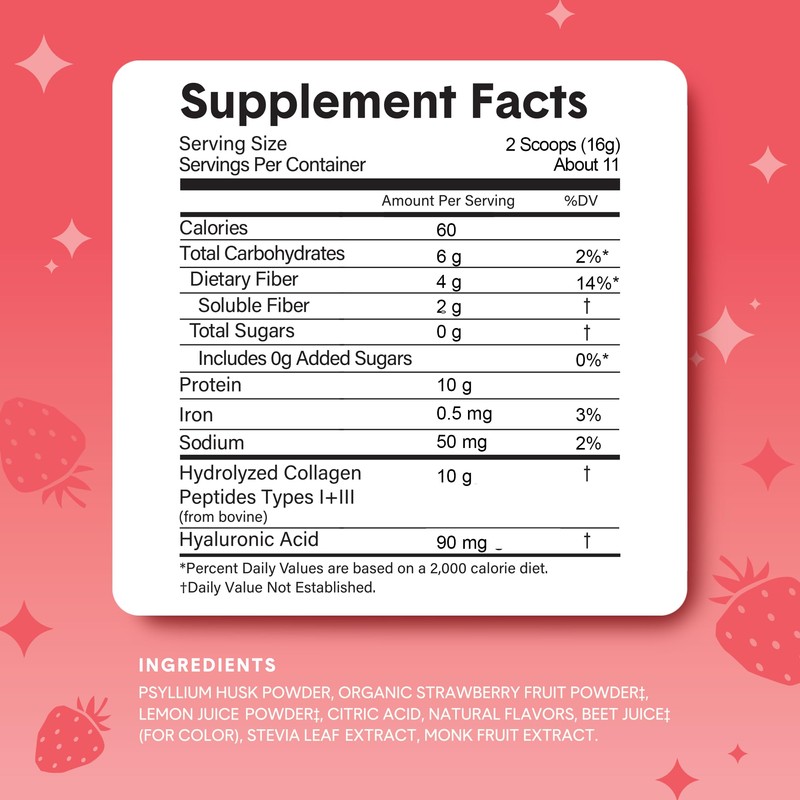 - 4g of Fiber & 10g of Collagen per Serving: Our psyllium fiber supports digestive health, reduce bloating, and regularity by nourishing the gut microbiome. The collagen & hyaluronic acid contributes to joint function, bone health, hair and nail strength, skin radiance, metabolism and digestion.