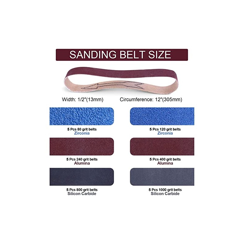 - SPECIFICATIONS Includes 5 specifications of 30 sanding belts, 12 inch single length, grit 80 120 240 400 800 1000 to meet more sanding requirements.