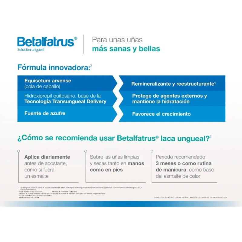 Beltalfatrus penetra profundamente para remineralizar tus uñas, restaurando su estructura natural y haciéndolas visiblemente más fuertes y resistentes. Actúa eficazmente para disminuir el dolor local causado por traumas diarios o exposiciones, brindando un alivio muy necesario. Además, es un aliado poderoso contra procesos inflamatorios ungueales, como la psoriasis ungueal, ayudando a mejorar la apariencia y salud general de tus uñas. Con cada aplicación, notarás cómo tus uñas recuperan su brillo natural, dejando atrás la fragilidad y el daño. ¡Despídete de las uñas quebradizas y dolorosas, y luce unas manos y pies impecables con la confianza que Beltalfatrus te ofrece!