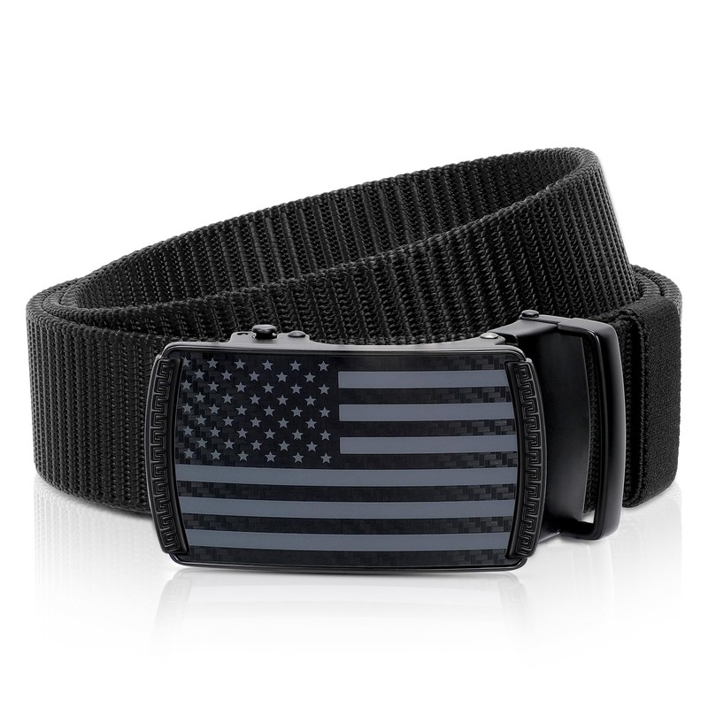 - [Unique Buckle] The men ratchet belt is made of aluminium alloy with flag patterned, has strong load-bearing capacity to meet your different needs. And the buckle mechanism makes sure the belt stays in place with comfort.