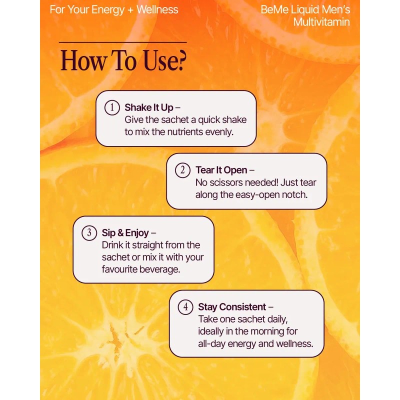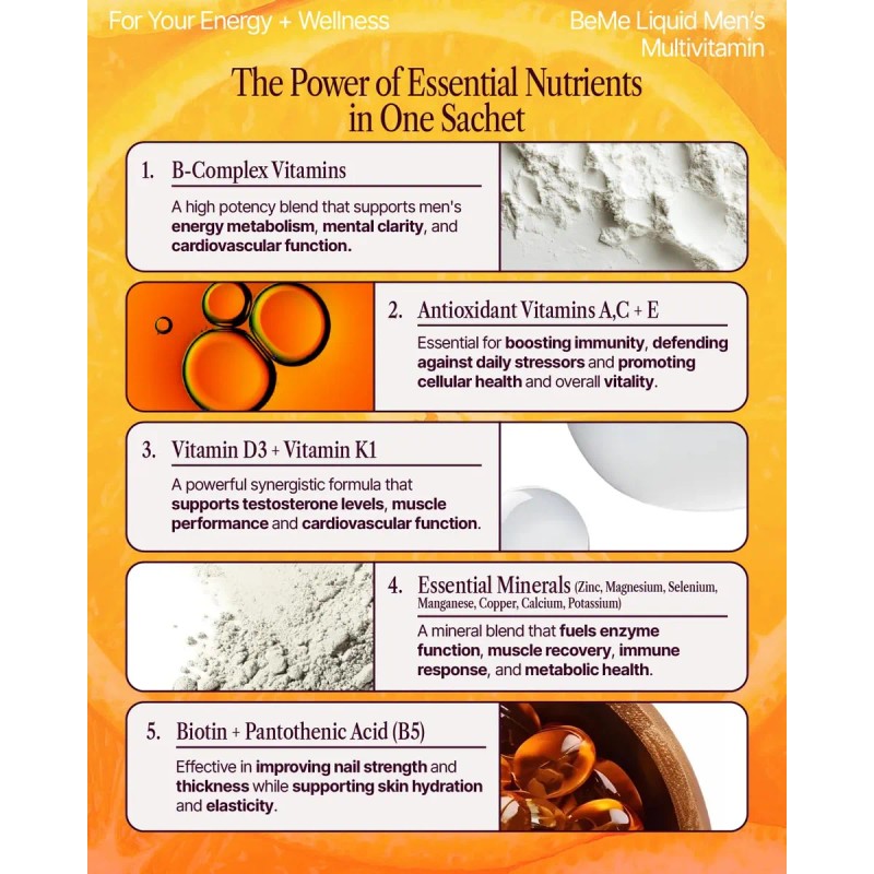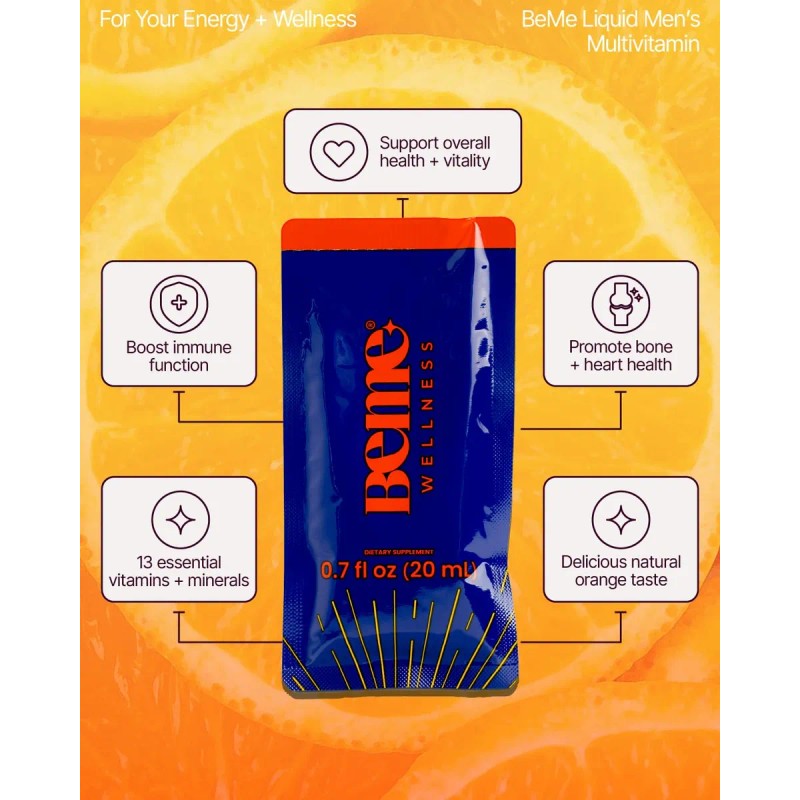Tamaño: 30 sobres (Paquete de 1) - Multivitaminas para hombres simplificadas - Comienza tu día con fuerza y enfoque usando multivitaminas líquidas BeMe Be Vitalized para hombres, con 13 vitaminas esenciales y 6 minerales en un shot con sabor a naranja refrescante. - Fórmula respaldada científicamente para bienestar masculino - Cada sobre listo para beber contiene vitaminas A, B-complejo, C, D, E, K líquidas de rápida absorción y biodisponibilidad, más calcio, zinc, magnesio, selenio, cobre y manganeso diseñado clínicamente para energía, inmunidad y salud muscular. - Multivitaminas convenientes para hombres en movimiento - Di adiós a pastillas voluminosas y polvos desordenados. Estos sobres tamaño bolsillo se ajustan fácilmente a tu rutina ya sea en el gimnasio o en el trabajo. Solo abre, bebe y energízate.