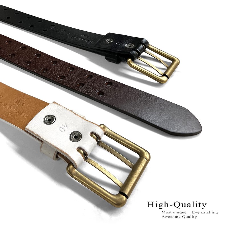 - 1-1/2" (38mm) wide leather belt with snaps system for interchanging buckles making it a versatile strap for different occasions.
