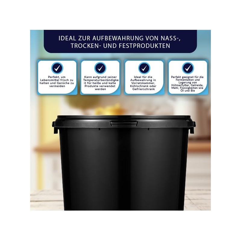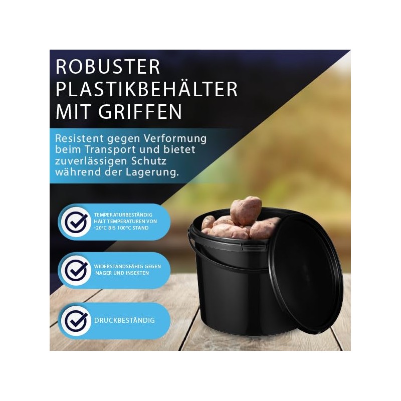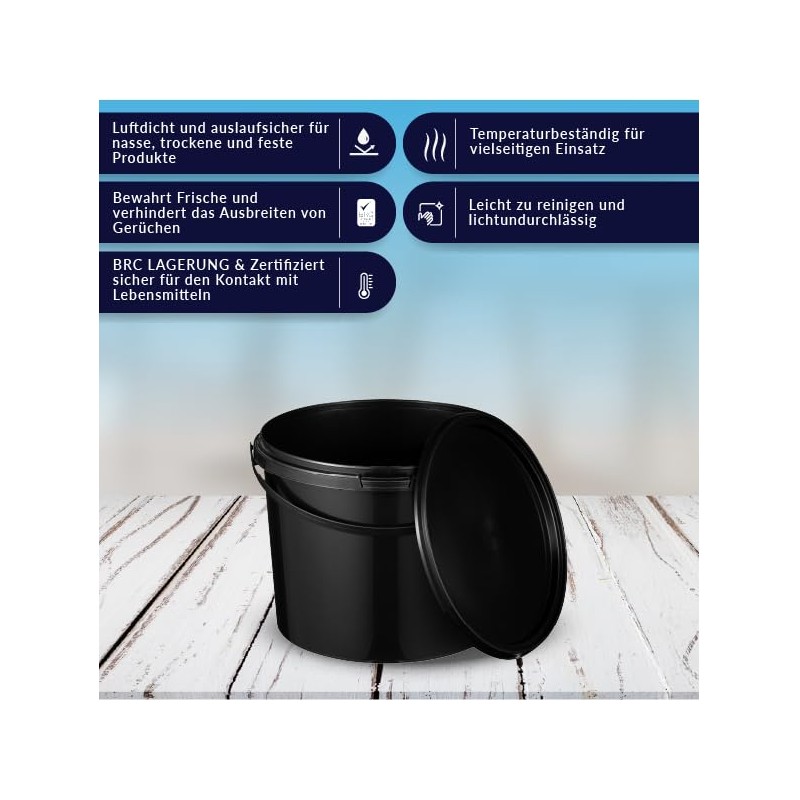 • Airtight – the waterproof plastic bucket with handle is versatile. Whether in the kitchen, shed, at work, in the workshop or in the garage - this bucket is the ideal companion. It is perfect for storing liquids (hot and cold), powders, granules and solid products as well as transport (without spilling). In addition, the plastic bucket has no labels or stickers.