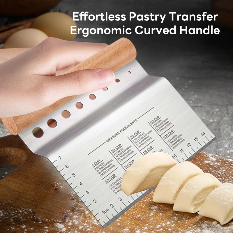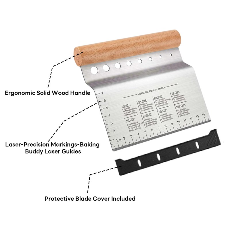 - Premium Material: Made from durable stainless steel, this bench scraper is built to last. The natural wood handle offers a comfortable, non-slip grip, while the blade comes with a protective cover for safe storage.