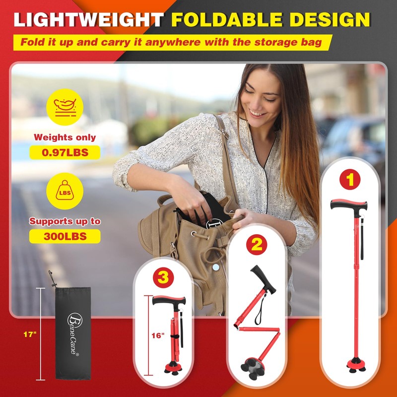 BeneCane Walking Cane for Men & Women Walking Stick for Seniors Folding Canes Quad Cane Adjustable Lightweight Sturdy Free Standing Collapsible Heavy Duty with Soft TPR T-Handle and Travel Bag