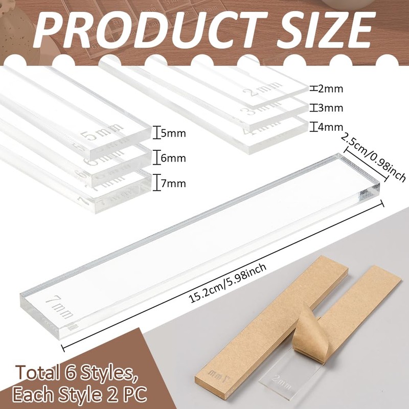 BENECREAT 12Pcs 6 Size Acrylic Polymer Clay Depth Guide Set, 2,3,4,5,6,7mmAdjustable Clay Rolling Pin Guide with Protective Film for Polymer Earrings, Roller Depth Guides