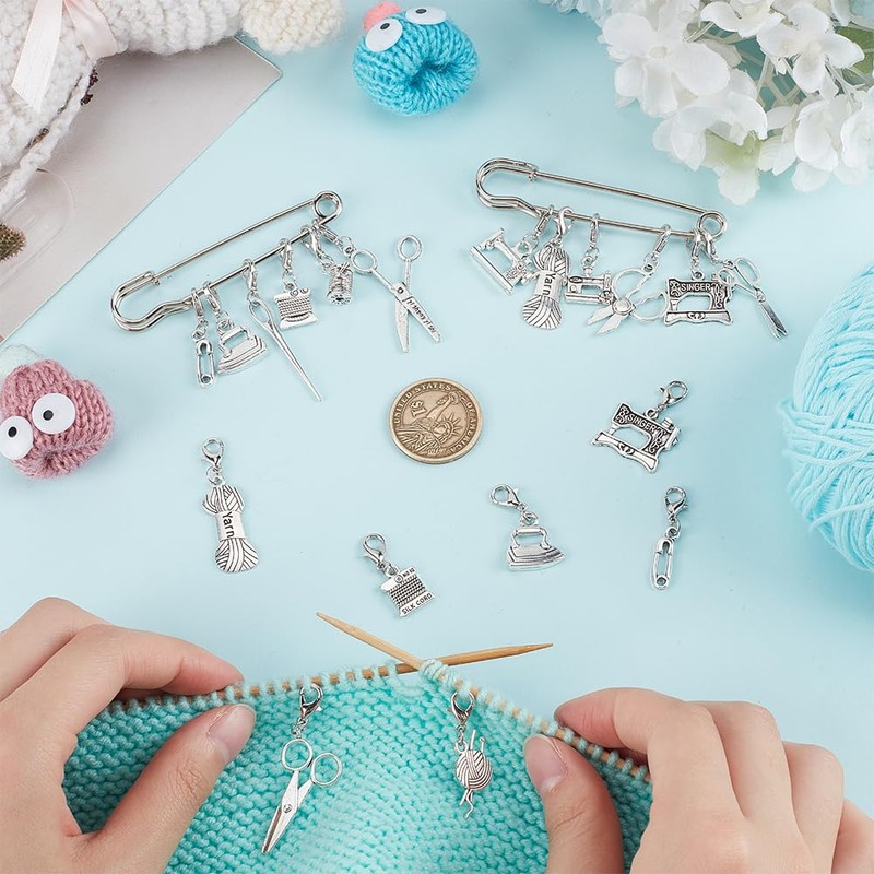 - Package includes: you will receive 3 style tailoring tool theme stitch marker knitting accessories, 2 sets/style, 6 sets in total. Comes with 6 safety pins, 36 lobster clasps and alloy jump rings