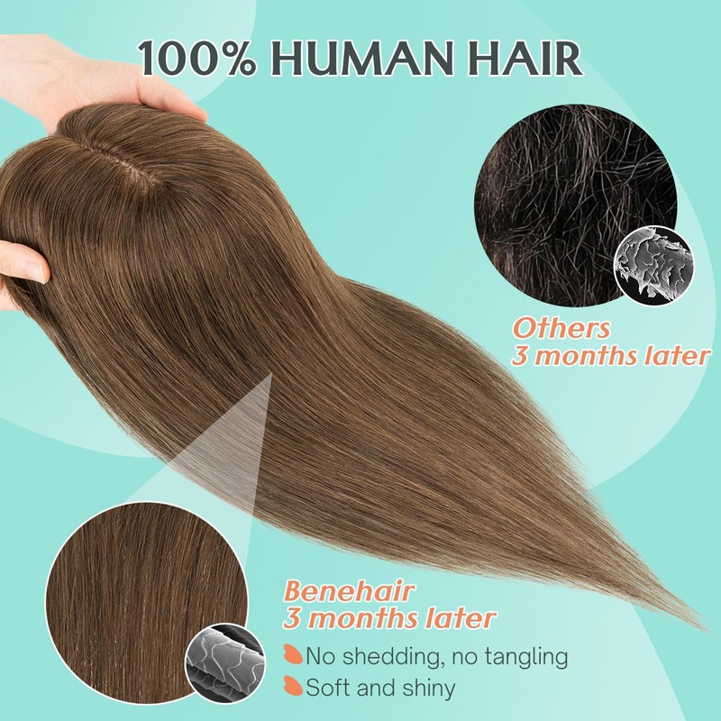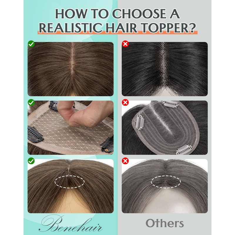 - Upgraded Material: 100%% Real Human Hair Hand Made Toppers. Shedding and tangle free, can bewashed, curled and straightened. Hand made base looks like real human scalp and totally fits your hair skin. Hair toppers is breathable, comfortable, softness,invisible and realistic