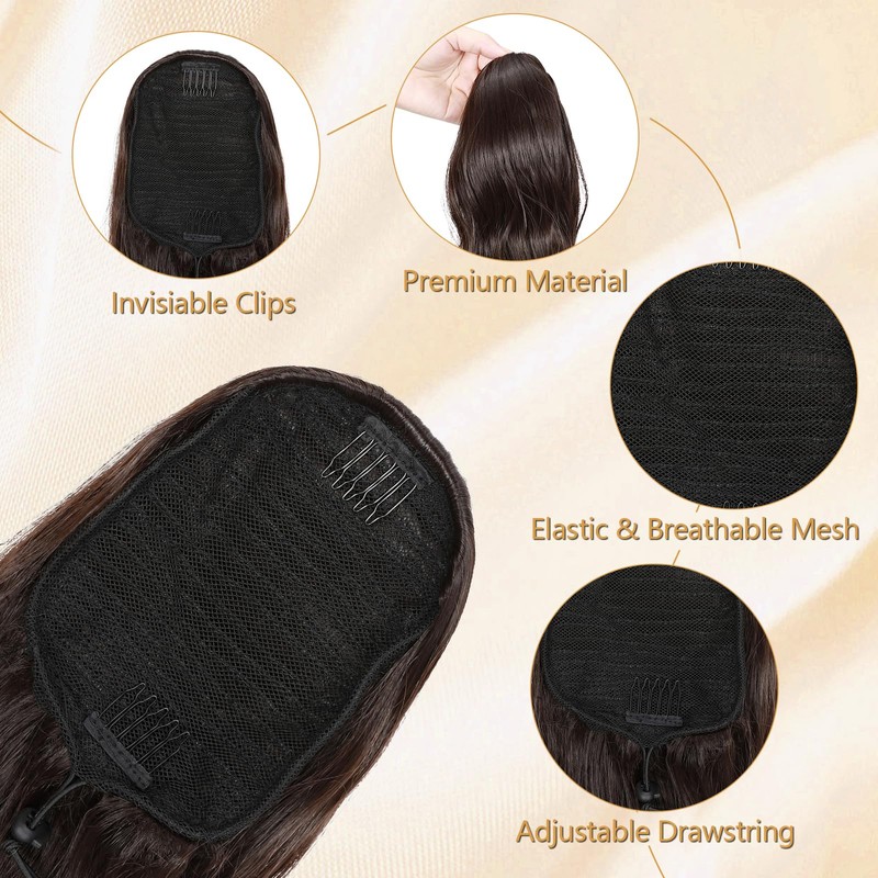 - Easy to wear: Our ponytail extensions are equipped with a drawstring and clips for a secure hold that lasts all day. Attached to your ponytail with a clip, the clips stay securely in place without damaging your natural hair.