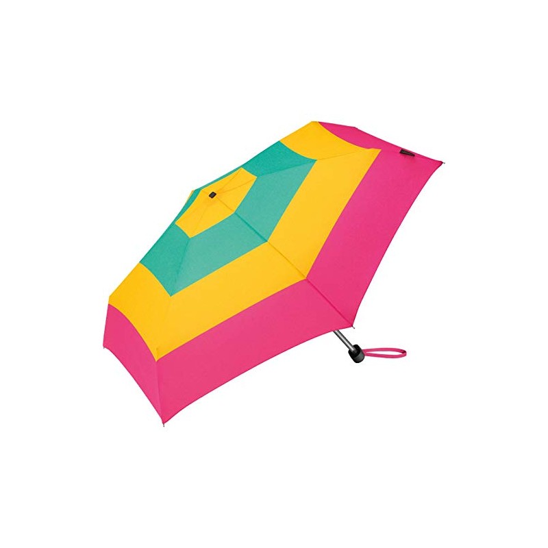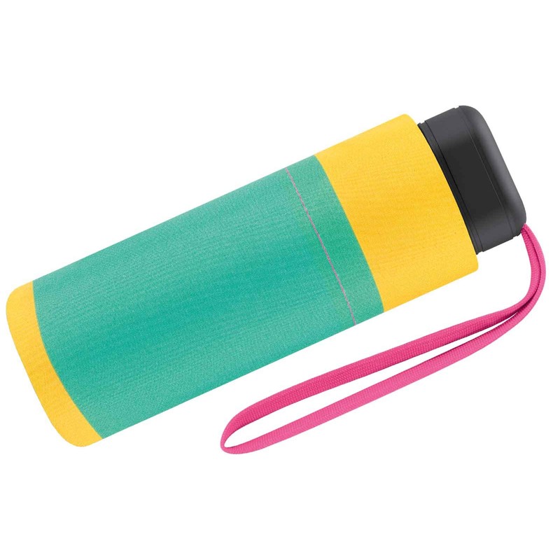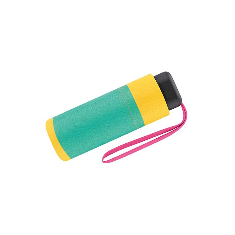 The colour of the canopy is yellow-green-pink, the material used is 100% polyester. Tiny small, stable and super light, the umbrella weighs only approx. 190 grams. When open, the umbrella roof is 88 cm tall and when closed, the umbrella measures 17 cm.