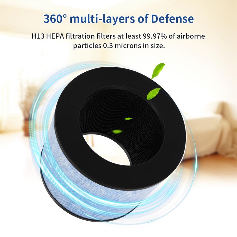 - H13 True HEPA captures 99.97% of airborne dusts PM2.5 up to 0.3 microns in size. Removes large and airborne particles, including dust, common pollutants, activated carbon reduces chemicals, VOCs, tobacco smoke, PM2.5, common bad household odor