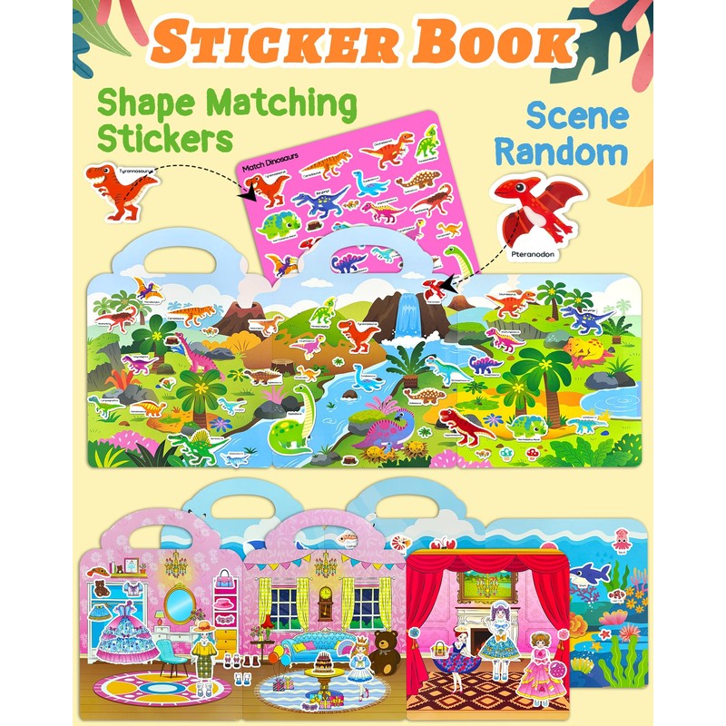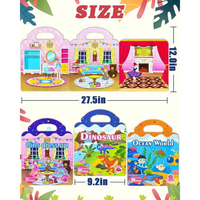 • Reusable Stickers for Kids: Sticker book is made with waterproof, reusable PVC material and contains 3 different themes - dress up, dinosaur and underwater world.