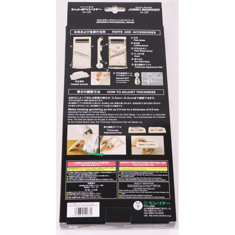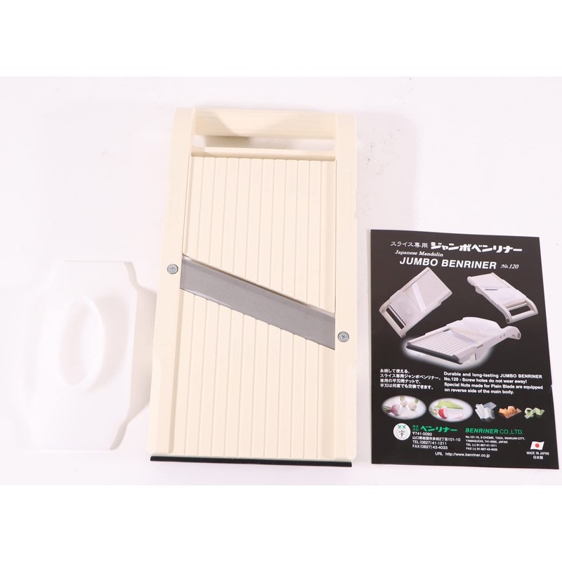 • Benriner's Beige Jumbo mandolin slicer easily slices larger fruits and veggies into consistently sized pieces that cook evenly and look great