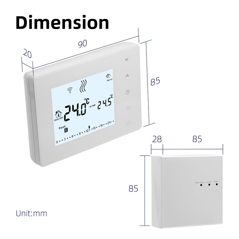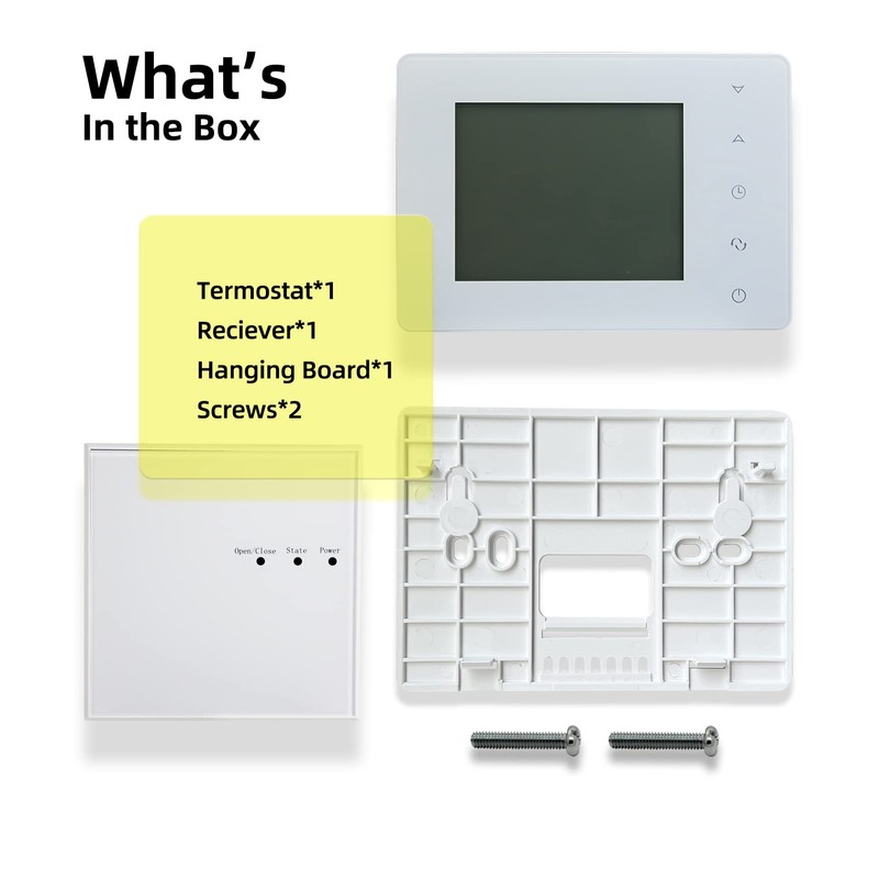 - Package includes: 1 x thermostat without battery, 1 x thermostat wall bracket, 1 x receiver, 1 x product manual (English language not guaranteed), 2 x screws
