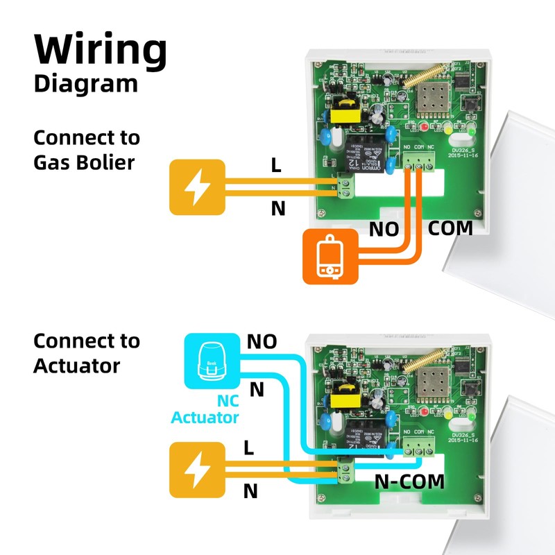 - RF wireless: the thermostat uses radio frequency technology, a thermostat and a receiver, the receiver is connected to the gas boiler, so you can take the thermostat and control the gas boiler in your home like a TV remote control, but you are better off if you use it within 100 metres