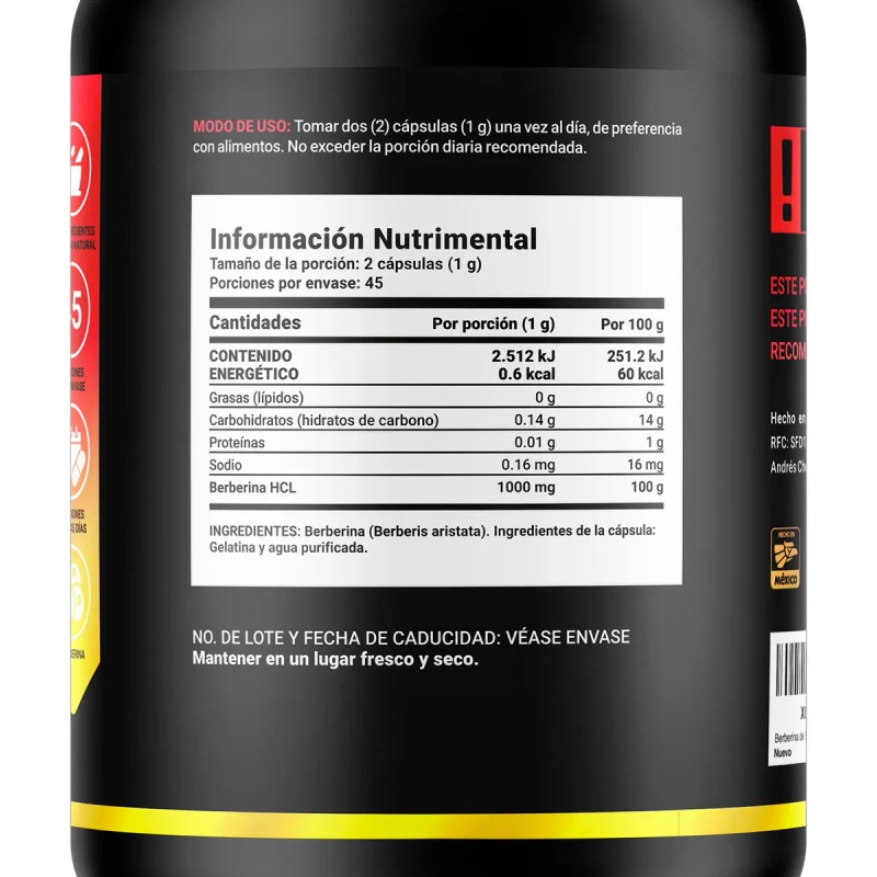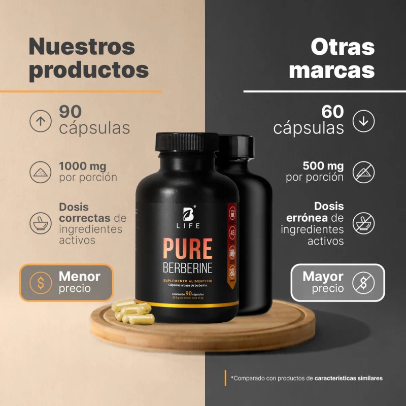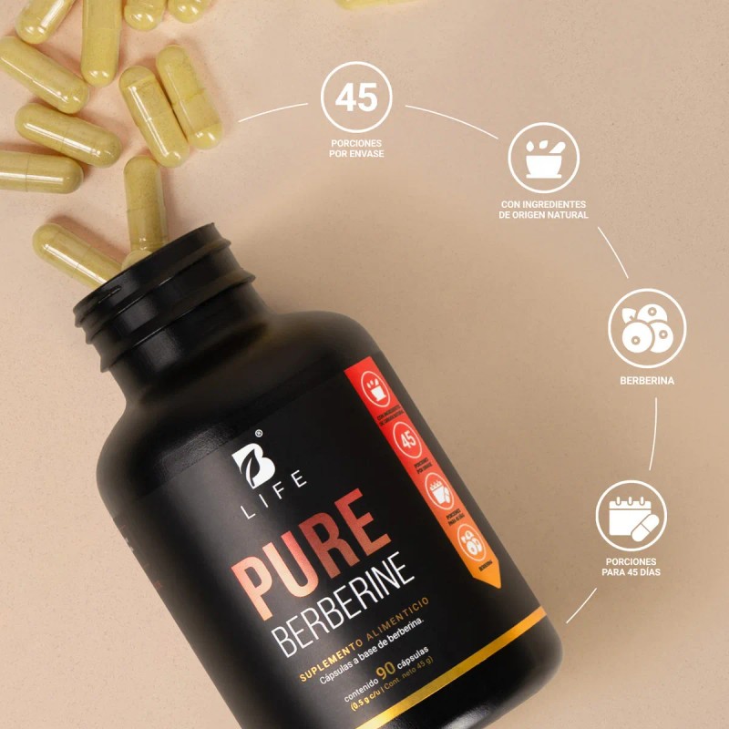 ¡Pure Berberine B Life, una fórmula 100% natural! Cada porción ofrece una concentración máxima de 1000 mg de Berberina HCI Pura (Berberis aristata), superando otras presentaciones que solo contienen 400 mg de este valioso compuesto para tu bienestar. Contiene 90 cápsulas.