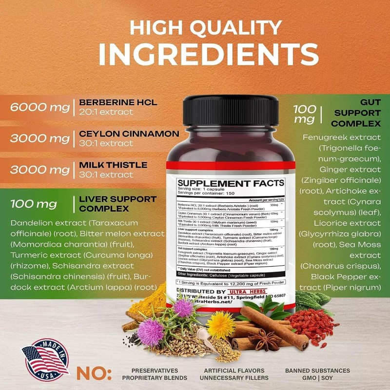 - 14 IN 1 extra strength formula, including: Berberine HCL, Ceylon Cinnamon, Milk Thistle, Dandelion, Bitter melon, Turmeric, Schisandra, Burdock, Fenugreek, Ginger, Artichoke, Licorice, Sea Moss, Black Pepper